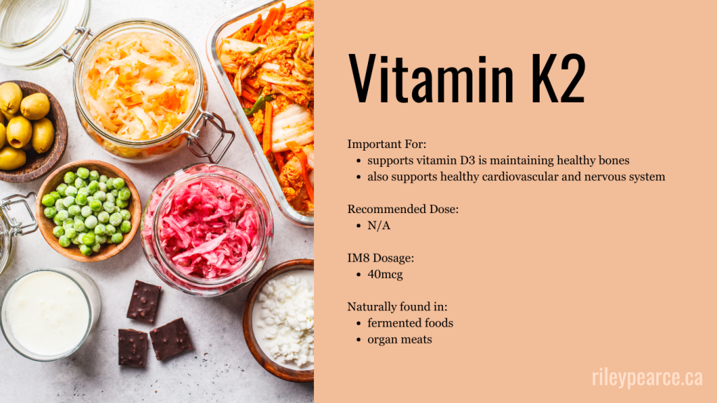 Vitamin K2 is the second form of vitamin K, and is found in much smaller quantities in whole food sources. It’s primary role is to work with vitamin D3 to support healthy bones by regulating calcium metabolism. This, of course, helps prevent osteoporosis, as we saw with vitamin D.