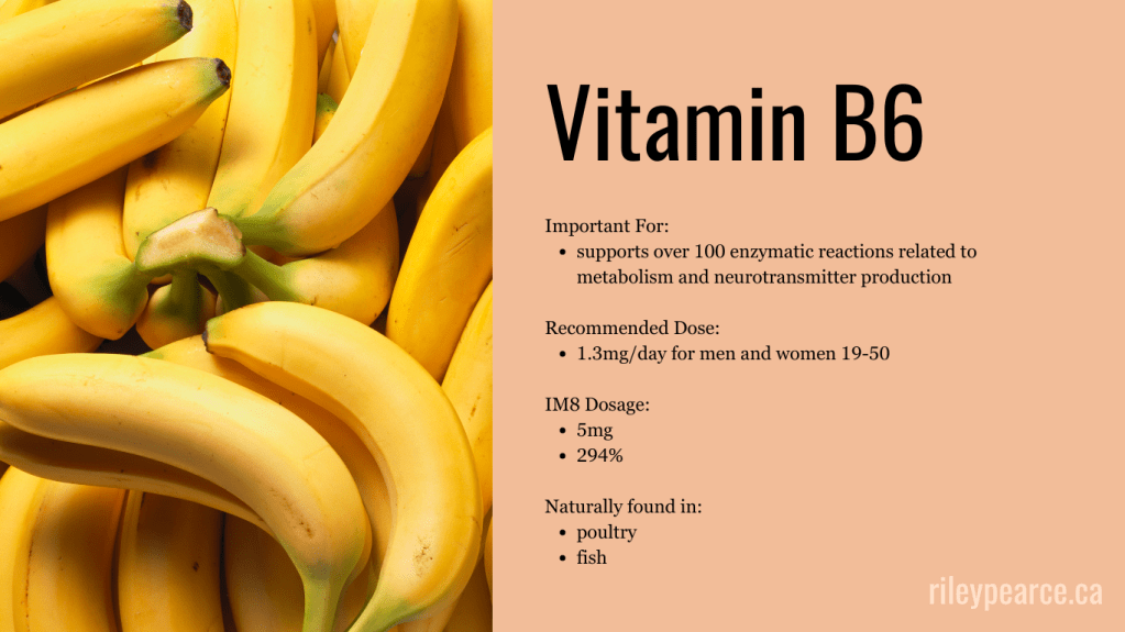 This B vitamin is absolutely crucial for normal brain function and to keep your nervous system healthy and functioning as expected. Your nervous system quite literally controls everything. So making sure you are consuming enough B6 is so important, and is likely why IM8 has included more than enough for one day.